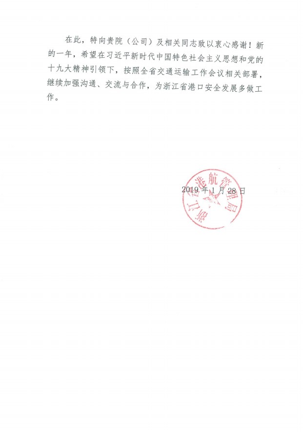 浙江省港航管理局給我公司發(fā)來感謝信
