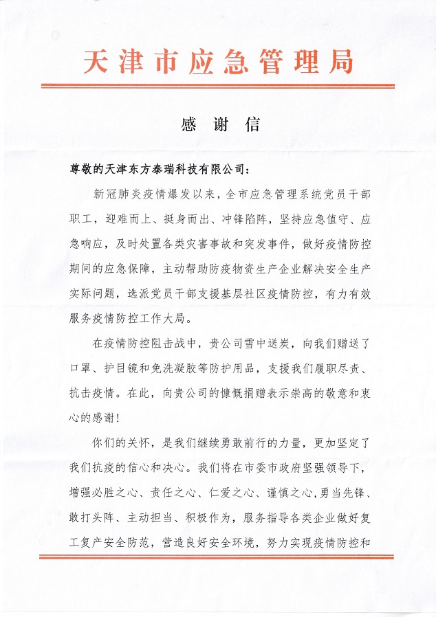 天津市應(yīng)急管理局給我公司發(fā)來(lái)感謝信