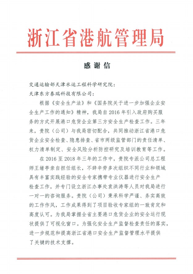 更新時間: 點擊:4571 所屬欄目:公司新聞 Update Time: Hits:4571 Belong Column:News近日,我公司收到浙江省港航管理局發(fā)來的感謝信,信中對我公司多年來一直積極配合浙江省港航局開展港口企業(yè)的安全監(jiān)督管理工作,提供的專業(yè)技術(shù)服務(wù)和相關(guān)人員的盡心盡職,科學(xué)嚴(yán)謹(jǐn),務(wù)實高效的工作作風(fēng),給予高度肯定。并希望今后雙方在工作中繼續(xù)加強溝通、交流、合作。