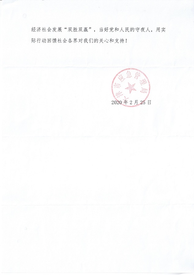 在新冠肺炎疫情爆發(fā)期間,向天津市應(yīng)急管理局捐贈(zèng)了口罩、護(hù)目鏡和免洗手消毒凝膠等防疫物資,切實(shí)支持疫情期間的應(yīng)急保障工作表示崇高的敬意和由衷的感謝。我們將在市委市政府堅(jiān)強(qiáng)領(lǐng)導(dǎo)下,主動(dòng)擔(dān)當(dāng)、積極作為,服務(wù)指導(dǎo)各類企業(yè)做好復(fù)工復(fù)產(chǎn)安全防范,營(yíng)造良好安全環(huán)境,努力實(shí)現(xiàn)疫情防控和經(jīng)濟(jì)社會(huì)發(fā)展“雙勝雙贏”,當(dāng)好黨和人民的守夜人,用實(shí)際行動(dòng)回饋社會(huì)各界對(duì)我們的關(guān)心和支持!