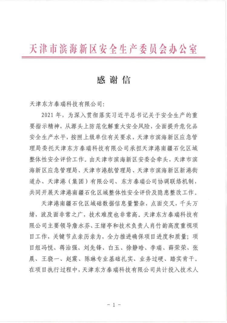 更新時間: 點擊:3002 所屬欄目:公司新聞 Update Time: Hits:3002 Belong Column:News2021年,為深入貫徹落實習(xí)近平總書記關(guān)于安全生產(chǎn)的重要指示精神,從源頭上防范化解重大安全風(fēng)險,全面提升?;钒踩a(chǎn)水平,按照上級單位有關(guān)要求,天津市濱海新區(qū)應(yīng)急管理局委托天津東方泰瑞科技有限公司承擔(dān)天津港南疆石化區(qū)域整體性安全評價工作。由天津市濱海新區(qū)安委會牽頭,天津市濱海新區(qū)應(yīng)急管理局、天津市港航管理局、天津市濱海新區(qū)新港街道辦、天津港(集團)有限公司和我公司采取協(xié)調(diào)聯(lián)絡(luò)機制,共同開展天津港南疆石化區(qū)域整體性安全評價及隱患整改工作。