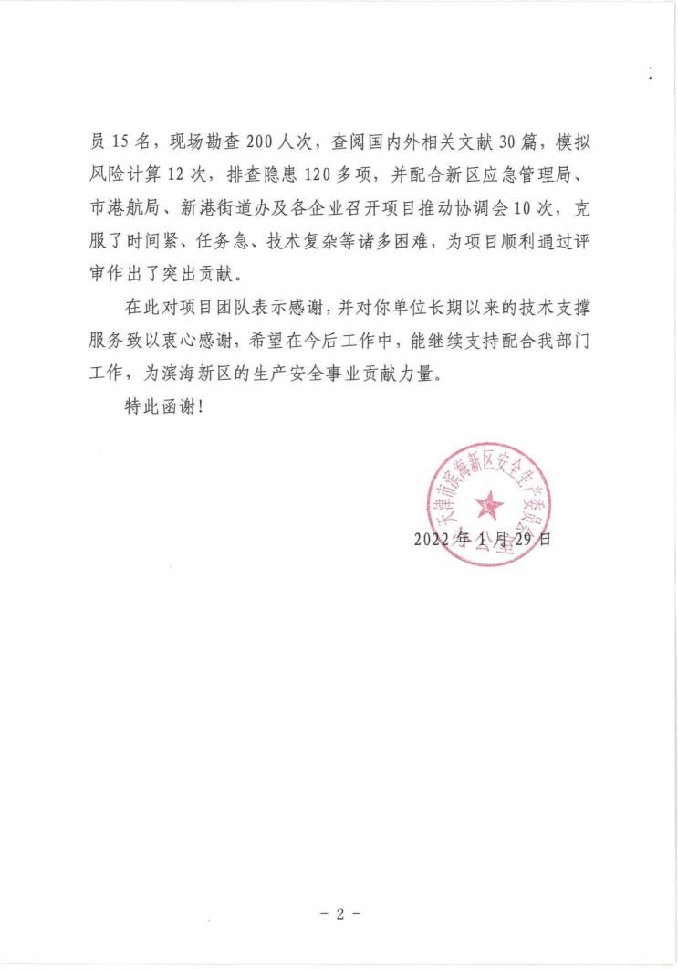 濱海新區(qū)應(yīng)急局張洪義副局長、市港航局港監(jiān)處于軍處長等相關(guān)領(lǐng)導(dǎo)參加了會議。張洪義副局長指出:東方泰瑞項目組以高度的政治站位、強烈的大局意識、真誠的服務(wù)態(tài)度以及高水平的技術(shù)能力出色的完成了本次評價工作,成果對于提升南疆港區(qū)安全風(fēng)險防控水平、未來發(fā)展規(guī)劃都具有重要意義。下一步新區(qū)應(yīng)急局、市港航局、新港街道辦、天津港(集團)有限公司及我公司將深化聯(lián)合協(xié)調(diào)機制,積極推動區(qū)域問題整改,完善區(qū)域內(nèi)企業(yè)的安全生產(chǎn)責(zé)任制,健全區(qū)域的公共安全體系,遏制重特大安全事故,進一步提升南疆區(qū)域防災(zāi)減災(zāi)救災(zāi)能力。濱海新區(qū)應(yīng)急管理局安委辦特向我公司發(fā)來感謝信,對我公司長期以來的技術(shù)服務(wù)與支撐表示衷心的感謝。
